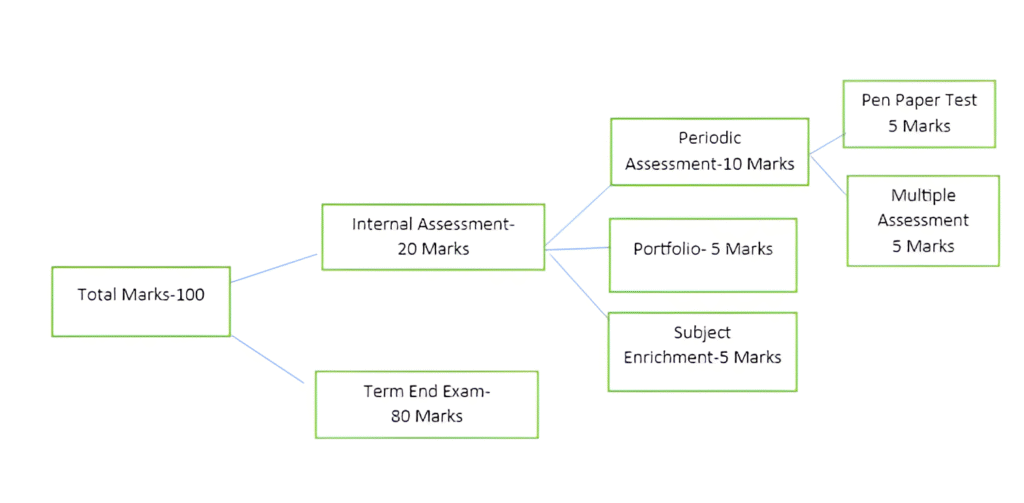 The evaluation system at The Global School of Excellence is based on a total of 100 marks, with 80 marks for the Term End Exam and 20 marks for Internal Assessment. The internal assessment includes Periodic Tests (10 marks), Portfolio (5 marks), and Subject Enrichment Activities (5 marks). This method ensures continuous learning, skill development, and overall student growth.
